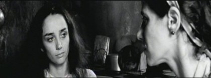 Right from the opening shot, the opposing forces of water and earth—the unconscious and the conscious—that will work on our heroine throughout the film are mixed. It is night, and a horsedrawn cart is seen moving along a dirt road through a veil of reeds in the foreground, bringing a old woman (Léa Garcia) who could be mistaken for nothing but a shaman to an inn. She is greeted at the door by a nervous younger woman, Concepção ((Dira Paes). They enter the inn and watch as the innkeeper empties a coffeepot and starts filling it with water. She and the old woman climb some crooked steps to the second floor. The old woman, Iraci, disappears behind a door as Concepção stands outside in the hall fretting and then runs downstairs to fetch the pan of hot water the innkeeper has prepared. Ah yes, a birth is about to take place.