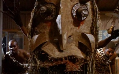 The Witches is an adaptation of a novel by Norah Lofts, who also provided the source material for John Ford’s last feature film, shot the same year, 7 Women, an equally interesting revision of genre film with a female-centric viewpoint. Here, a bizarre and jarring prologue immediately hits a note of frantic alarmism, as it offers a fin-de-siecle twist on colonial do-gooder tales like The Nun’s Story (1959). Fontaine’s character, Gwen Mayfield, running a school in a colony beset by a Mau-Mau-like uprising, tries to pack up and flee before the menace comes calling. Her native assistants are so frightened by the curse of the local Juju man they finally abandon Gwen. The door is bashed in, and the Juju men, one wearing a colossal tribal mask, enter, presumably to rape and abuse our heroine.