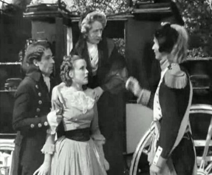 The film begins with a discursive sequence of soldiers parading under the window of the Prince of Wales (Nigel Bruce). The Prince’s bluff and hearty charm seems for much of the movie as disconnected as the rest of his countrymen from the international reality, his soldiers marching prettily but not actually doing anything. The Prince confesses his pride in the fact that the Scarlet Pimpernel, rapidly becoming famous for his escapades, is English. In Paris, the situation the Pimpernel is fighting against is coldly depicted as victim after victim is sent to the guillotine in an assembly line of slaughter, and a neat dissolve from the guillotine itself to the Revolutionary logo of Liberty, Fraternity, and Equality packs ironic punch. A priest (Bramwell Fletcher, of The Mummy “He went for a little walk!” fame), actually one of the Pimpernel’s agents, gets an earful of bloodlust from a barber, before visiting a prison where families of the fallen nobility cringe in the cellar as a revolutionary official announces: “Madame Guillotine has fresh meat today.” The fake priest delivers a message in a bible to the family of the Count de Tournay (O. B. Clarence), his wife (Mabel Terry-Lewis) and daughter Suzanne (Joan Gardner). De Tournay, the former ambassador to Britain, is introduced playing cards with his fellows and contemplating with hard-won wisdom that his class has been “sheltered all our lives,” establishing him as a nice aristocrat fit to be rescued. As victims are called up to the tumbrel, rapid vignettes of grace under pressure include one aristocratic woman placing aside her book and adjusting her gloves with seemly calm, whilst outside the baying crowd awaits. Wife and daughter are dragged away to their deaths, torn from the Count, who is held back to be taken Robespierre.