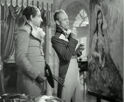 The remainder of the narrative revolves around a peculiar question: is Percy’s wife one of the people he despises? Is he operating out of guilt for her actions? Marguerite is first mentioned in a tavern conversation between Ffoulkes and the De Tournays, as they tell him about her evil acts, and he states with defensive pride that “Everyone in London knows Lady Blakeney.” Marguerite is introduced thus, like her husband, first through gossip and second-hand perception, an accumulation of legends that address only one apparent side of their natures. She is first glimpsed properly having her portrait painted by George Romney (Melville Cooper), supervising her conversion into a perfectly aestheticized image as Romney would do for Emma Hamilton. Percy studies the work twice, once in full fop character and then again more like himself, and finds it frustratingly lacking, as he attempts to discover the true woman behind the various images of her. As the husband wears a mask of false identity, he is questioning whether his wife does, too. When Armand asks about the chill between the couple, Percy explains that he once asked if she had truly denounced the Saint Cyrs: “She flashed back a yes as sharp as the guillotine!” “So that is why you ceased to love her,” Armand says, “What a tragedy.” Percy replies, “I shall love her ‘til the day I die, that’s the tragedy.” Such a line captures The Scarlet Pimpernel‘s rare feel for the smouldering romanticism lurking under the seemingly stoic and staid English surface. The very French and expressive Marguerite is conversely suffering her sudden and chilling alienation from Percy, who, as far as London society is concerned, is a shallow, witless gadabout obsessed with fashion and trivialities.