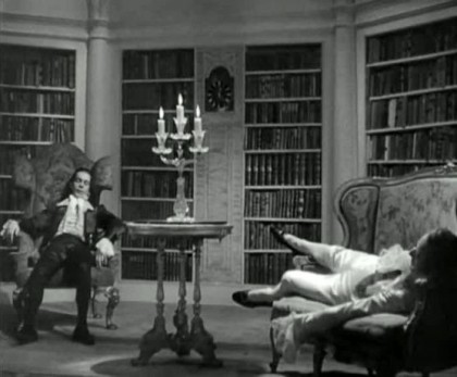 The film’s multiple story strands collide in a lengthy sequence at a ball held by Lord Grenville (Allan Jeayes) in which dancing is dismissed as frou frou in favour of the far more intricate cotillion of role-playing and gamesmanship. Percy swaps gracefully between fop and spymaster (he’s able to rescue himself from the coterie of trailing women and make contact with one of his agents with the cry, “Zounds! That’s a monstrous good collar!”), Chauvelin stalks through the proceedings with his hunting-dog smirk, and Marguerite is caught between camps, cold-shouldered by the De Tournays until the Prince, who worships Marguerite, commands them to make friends. Marguerite is tasked by Chauvelin to obtain a message Ffoulkes has tucked in his sleeve, and Marguerite rises to the challenge in a sublimely odd sequence in which dance music drifts sonorously in from the ballroom, Ffoulkes tries to both aid Marguerite and read the message, and Marguerite looks for a chance, any chance, to see it, too, whilst a confused crackle of the erotic and the illicit infuses the game of deception. She finally succeeds in getting hold of the letter and is able to reveal its contents to Chauvelin, that the Pimpernel will be in the library at midnight, which proves true, only Percy makes a play of being asleep on a couch, sprawled with indolent laziness. Percy seems to fake Chauvelin out by this means, but his joke proves to have been a bit too clever, for Chauvelin quickly realises the truth and sets in motion a plan to catch Percy the next time he ventures to France.