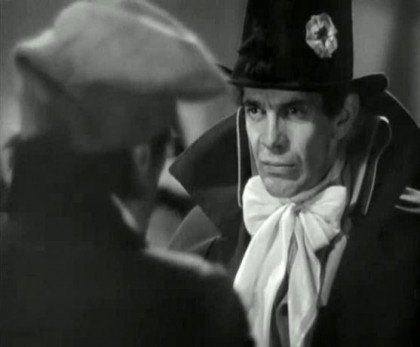 Oberon was still a fairly fresh-minted movie star, although she had been leading a life laden with novel-worthy mystique for much of her life, rising from headliner in Bombay nightlife in her early teens to several years of bit roles after landing in Britain, and discovery by Korda, whom she would marry. She would go on to be an underutilised but reliable star in Hollywood, but she inhabits the difficult role of Marguerite perfectly. She keeps Marguerite’s emotional quandaries in focus, smouldering with guilt and disaffection even as she’s called upon to be the perfect, nerveless beauty, wife, secret agent, and emotional prostitute, speaking with rueful sadness after her husband’s made another of his embarrassing displays, “The biggest fool in England has the most complete contempt for his wife,” and insulting Percy with bite, “You were a man once!” The quiet romanticism of the film is indeed laced with the bitter taste of its opposite, the Noel Coward-esque cynicism apparent as Percy, in character and yet delivered with cold brutality, responds to Marguerite’s proposition that they should help Armand get married, “What has poor Armand done to be sentenced to matrimony? You should know better, my dear.” Massey likely never quite had as much fun in a film role as here, playing Chauvelin with a plummy, come-and-go accent, but more effectively offering his hangdog face and perpetual five o’clock shadow to imbue a faint air of shifty dishevelment to Chauvelin’s pretences to elegant villainy, the inelegant method and functionary brutality underneath constantly in evidence. His exchanges with Percy in foolish guise are droll in Chauvelin’s recoiling disgust of the seemingly oblivious aristocrat who sneakily makes jabs at Chauvelin’s fear of the guillotine under the pretext of giving him fashion tips; whenever Percy reaches to adjust Chauvelin’s cravat, the envoy recoils in alarm.