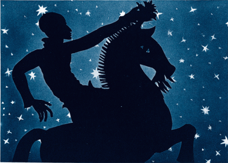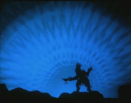 The silhouettes themselves and the multiplane settings in which they interact are highly detailed and absolutely beautiful. For example, elaborate star-decorated robes, amazing in their cut-out detail, clothe Pari Banu and Princess Dinarzade, and set pieces such as the stolen palace floating on a cloud back to Persia have mystery and wonder written all over them. But I was most impressed by the amount of personality Reiniger was able to infuse through posture and natural-looking actions. When Pari Banu and Achmed kiss, it looks more real than many of the Hollywood kisses I’ve seen in countless movies of the Golden Era. Her attention to detail, not only in the forms but also in the actions the characters take, is astonishing. For example, Achmed is fighting a hydra-like demon summoned by the Sorcerer. Every time he cuts off one of its heads, it grows back. The Mountain Witch comes to help him by cauterizing each neck that has lost its head, thereby preventing it from growing a new one. This attention to a small plot point shows more care than many of the CGI action films we see today. And the color tints, restored to this film in 1998, give a jewel-like brilliance to this fantastical tale.
