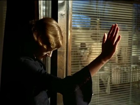 What follows is the definition of a chamber piece, but Fassbinder renders his limited setting almost impossibly lush by several tricks of décor, including, most obviously, a wall covered with a detail from Nicolas Poussin’s “Midas and Bacchus,” with a nymph’s feminine form prominently sprawled. Mannequins and busts to support Petra’s array of wigs lend a kind of immobile chorus to the proceedings, and later, to mock her own situation, Petra arranges those mannequins in sexual positions. Fassbinder uses the layout of the apartment for the most cunning effects of mise-en-scène, like having Marlene watch Sidonie and Petra from a another room via two windows and fingering the glass with hopeless, alienated angst, or, later, using a bench top to divide the frame in such a way as to perfectly realise the sudden schism between lovers. He even plays games with the amount of available space in the apartment: in early scenes, Petra’s bed dominates the set, but later it’s pushed away so that Petra’s bedroom is a great wilderness of white shag carpet in which she flounders in an alcohol-pickled rage. The almost maddening closeness of the space is pushed even further in the scene of Petra’s seduction of Karin, as Marlene, present as always yet rendered a nonperson by Petra’s regime, bangs away relentlessly on a typewriter, her noise almost omnipresent and yet unprocessed. Pointedly, Marlene only stops typing, as she had earlier stopped working, when Petra begins to speak of her own failed amours. Marlene’s desire for knowledge of Petra’s mental landscape is matched only by Petra’s complete uninterest in the mental landscape of others.