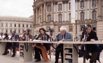 It is the Table of Free Voices that forms the substance of the different kind of documentary that is Problema. The film “documents” a real-life circumstance, but it is the opposite of what I usually like in a documentary: it is nothing but talking heads. Problema records what happened when 112 people the organizers wanted to hear—primarily heads of nongovernmental organizations and activists like human-rights champion Bianca Jagger and physicist Hans-Peter Dürr, artists like Wim Wenders, and professional thinkers like Cornel West—talked about the great challenges of our day. The unusual format of the roundtable discussion (and yes, it literally was conducted at a round table in Berlin’s Bebelplatz, where Nazis burned books) was to have moderators Willem Dafoe and Nigerian human-rights advocate Hafsat Abiola alternately read each of the 100 questions culled from the dropping knowledge forums and have each participant give his or her answer simultaneously. A camera set up in front of each seat recorded their messages, and these messages, shots of the event taken by Schmerberg’s cameras, and thousands of images illustrating the various topics under consideration comprise the documentary.