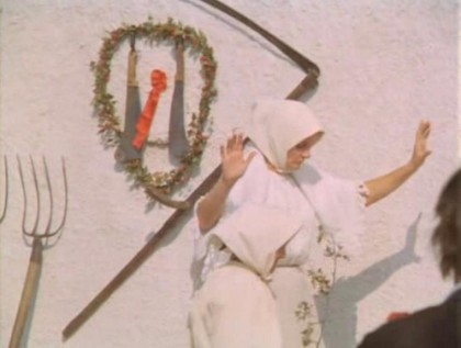 Red Psalm, the original Hungarian title of which means “And the People Still Ask,” is often described as a musical, and there’s some truth to that, though not in the style the phrase usually suggests. In spite of the long takes, it’s not one of those passive-aggressive films full of intolerable static patches; rather it’s defined by constant, restless motion and activity. It’s a work that wouldn’t and didn’t upset Hungary’s Warsaw Pact government of the time, and yet it’s more than merely a hymn to official socialism past and present; it trafficks in the future, the what-might-be as well as the fait accompli, and to revolutionary traditions domestic and foreign. It’s no mere artistic grovel, but a morally engaged film that tries to articulate the vital moment when the powerless try to create a space in which they have power. Likewise, the English title draws out one aspect of the tapestry texture of the film: there’s an attempt to purify the corrupt, power-serving church and return to a grassroots sense of faith that’s inextricable from the earth and communal identity, a kind of Christianity reconnected to nature worship.