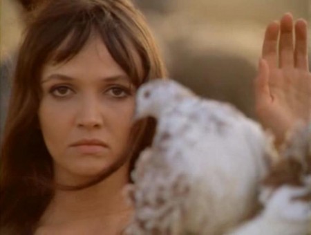 Yet Jancsó also acknowledges the deep roots of faith in the soil and the labours of humans, as his camera passes from a young woman ringing bells for mass to others carrying religious paraphernalia onto a table loaded with the bounty and sustenance of the peasants’ labour, including a loaf of bread that one of the women carries as if it were a holy talisman. Jancsó, whilst playing games with the movie musical tradition, also channels the nature imagery of specific forebears in the Eastern bloc film tradition—Dovzhenko and Paradjanov—but unlike the latter filmmaker, he doesn’t mystify even whilst evoking mysticism. Later, when disavowing use of weapons and the implements of violence, one of the men quotes the Book of Isaiah about beating swords into ploughshares. The line between Christian sacrament and pagan fertility ritual all but disappears as the film progresses. An old man listens with apparent joy to the words of the group, but then cuts his wrist and bleeds to death, and Balint covers him with his shirt: why is an absolute mystery, unless it’s to not have to live past the moment of perfect joy he’s found. One of the militiamen, Janos Nagy (Márk Zala), is inducted into the peasants’ number with a ritualistic fervor as women touch his head with branches as he disowns his evil acts.