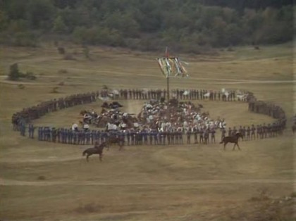 Detailing a fictional, but exemplary situation some time in the 1890s, Red Psalm portrays a collective of peasants attempting to resist all attempts by landowners, police, and finally, the military, to force them to sell their farm produce in the same way they always have, for a fixed (in both senses of the term) price to oligarchic landowners. When the film commences, the collective has already formed and made its declaration, and are waiting by a small chapel for the inevitable pressure that will come from the powers that be. The location is the agricultural flatlands, beautiful and spacious, ripe and giving. The peasants read a letter from Engels to the Hungarian socialists to bolster their stand, whilst haughty, bossy militiamen, cadets, and a bailiff gather to try to intimidate them: a quartet of young officers patronise them, asking if they understood Engels’ letter. The bailiff gives out drinks as a goodwill gesture, but the peasants pour it on the ground. The bailiff reiterates the usual payment in money and wheat for their produce, but one of the militiamen sets fire to the cash and the rest begin to walk away after being taunted by the peasant women, allowing the rest of the collective to grab the bailiff, stuff him in a sack, and drag him away. The peasants are barely differentiated by names or biographies, but some begin to emerge in individuality: one, Balint (József Madaras), maintains a conscientious and calm probity, whilst a woman in a blue dress and headscarf is the most forceful figurehead of the collective’s purpose.