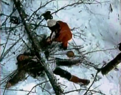 Throughout the film, events and motives are tangential, especially emotion, extreme passions driving events on with organic but illogical force: Ivan’s father denouncing Guteniuk to expel his grief over Olexa; Ivan slapping Marichka to punish her for her father’s violence and then forgetting his father when being with Marichka; Ivan marrying Palagna to forget Marichka, whom he loses in a totally capricious accident; Palagna’s acts to make Ivan want her putting her in Yura’s orbit and then forgetting her husband. Even the accidents and idiocies of this world are inspired by some other, possibly noble, cause. There’s a coarse, realistic kind of psychology here, where people sublimate one need into another, and small twists of circumstance throw lives entirely off course. Tribal microeconomics are also described with terse import, as the prosperity of the Paliychuks is degraded as their labouring menfolk have been steadily decimated (Mother Paliychuk recites the names of her many lost sons and her husband) and the Guteniuks’ rapacity contrasted, an imbalance with long-reaching, murderous consequences. Ivan is the victim of a world out of equilibrium before he even arrives in it. What holds that world together is communal ritual, the reflexes of which are a refrain of the film’s texture: from Paliychuk’s funeral marchers, tramping in single file across the snow-caked land, to the villagers dancing in a long line, Marichka and other adolescent girls arrayed with sprigs in their hands in the church, blessed in their youthful fertility, and the curious binding motif of Ivan and Palagna’s wedding: universal customs described in specific terms, of course.