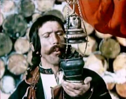 Under pressure, Khoma’s roots in the hard-drinking, hard-living Cossack way are swiftly revealed, whilst to the villagers he represents a momentary insight into a way of life usually cordoned off from their own: “Just what are you seminarians taught?” one demands to know: “What the deacon says when he’s in church, or other things?” Khoma, hardly paying attention, performs an expert trick with his vodka cup, making his drinking companions coo in wonderment, “What a great scholar! I want to be a seminarian too!” The filmmakers inject a visual joke as Khoma, thoroughly soused, sees three different versions of the same man emerging from three tavern doors. For all his faults, though, once Khoma feels the heavy hand on his shoulder the smiling face only briefly distracts from, and is forced to go through with his terrifying vigil, he has our sympathy, for his reactions are only to a strange, arbitrary, humiliating world only slightly more coherent than the manifestations of the supernatural that dog him. The sight of the old witch turning Khoma into her personal pony-boy, laced with perverse erotic suggestions even as it’s played for laughs, is echoed later when one of the villagers recounts how Pannochka ran off with one of the young men of the village, who carried her out on his shoulders. The villagers were well aware Pannochka was a witch; only her father had no clue, and although he senses something strange in her dying wish to receive holy rites from this specific, unworthy representative of religion, nonetheless he commits grimly to the task.