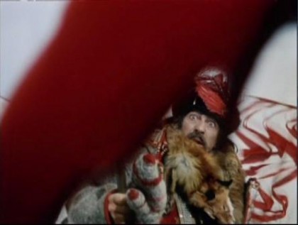 Motyl, Belarussian by birth, had gotten into trouble with Soviet authorities with his previous film, Zhenya, Zhenechka, and ‘Katyusha’ (1967), for its “disrespectful” take on the Great Patriotic War, clearly identified with the displaced state of Sukhov and his pining for a place in the world. His setting and time frame here, as well as the delicacy of the humour he employed, allowed him to bring just the hint of a scallywag attitude to onerous official creeds whilst also earnestly celebrating his hero as an exemplar, and proved here at least that he understood his audience exactly. The film changes radically in emotional key if not in apparent style once Abdullah turns up, trailing a force including Sayid, who, after shooting down three of Abdullah’s men when they seemed to be attacking him, is convinced by the bandit to join his party for a better chance of avoiding being buried to his chin again. Whilst Sukhov snoozes with dreams of harem comfort, Abdullah and his force enter the museum, and Abdullah first sneaks into the women’s quarters and strangles Gyulchatai, and then uses her veil to surprise Petrukha and kill him with his own rifle’s bayonet. The key image of slaughtered youth, scanned in a high shot by Motyl’s camera affecting a godlike blend of dispassion and awareness, drives Vereschagin to rouse himself and help Sukhov in fighting off Abdullah. Abdullah is an immediately persuasive and eye-catching villain, as Motyl cast Kavsadze, a good-looking hulk of an actor who threatens to outweigh Sukhov not just in size but as a potent screen presence, one whose sadistic violence is just as offhand and unfussy as Sukhov’s heroism. Abdullah’s sense of entitled authority immediately manifests in his ugly killing of Gyulchatai and then asking his remaining wives why they haven’t saved him the trouble of killing them by doing it themselves in obedience to his will.