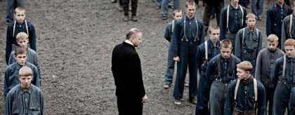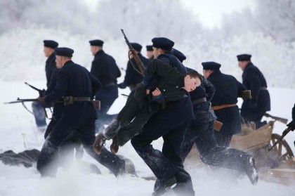 This film takes its time developing its story. We get the lay of the land, the primitive conditions of life, the cold and damp, the heavy manual labor used to build character. We don’t really get to know the characters, so some of their actions come more out of the machinations of the script than the performances, yet the faces of these boys, cast after a nationwide search for “1915 faces,” tell volumes. One small boy has no lines, but the camera goes back to his stern, serious face again and again. When he is the only boy who stands his ground against the troops—not killed, as we fear, but scooped up with one arm by a soldier as they capture the rebels—we are not surprised. Indeed, as we await this showdown, it comes as a huge surprise that not one boy is actually harmed by the troops.