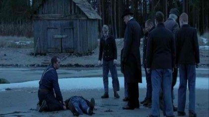 Inside the apartment, Håkan is packing a square case with a plastic bottle, a knife, some contraption fitted with a mask, and a plastic coat. He goes into an isolated wood where he encounters a teenage boy. Distracting the boy, Håkan places the mask over the boy’s face and renders him unconscious. He puts on his plastic coat, wraps a rope around the boy’s feet, tosses the rope over a tree limb, and hoists him up. He places the plastic bottle under the boy’s head, slits his throat, and catches the blood that pours from his neck.