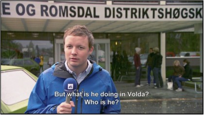 The film crew members seem like believable college kids, excited by their adventure at the same time as they are taking their role as reporters oh so seriously. Thomas doggedly pursues Hans after he has told them to get lost, and Kalle says from behind the camera that maybe they should give up. Thomas retorts, “Would Michael Moore give up if he didn’t get the story on the first try?” Almost simultaneously, the hubby and I had the same thought: No, he’d just make up something and call it a movie. It was a funny joke for us, but I’m not sure Øvredal was going for that punchline.