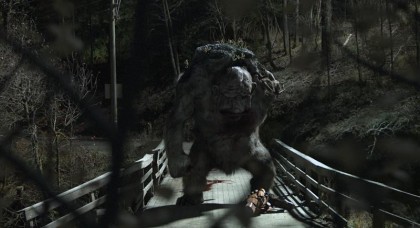 Still, the real villain of the piece is (of course) Finn Haugen. The more the students wonder why the public is being kept in the dark about the TSS, the more threatening he becomes. Clownishly trying to explain why a Russian bear, its tongue sticking out like a cartoon creature, was found in Norway (a hilarious bit with a Polish delivery crew that supplied the bear “under the table” has to be seen to be appreciated), he turns into a bigger danger for the camera crew than the 200-foot-tall troll they just saw Hans dispatch. The obligatory title cards at the beginning and end of the film about the circumstances under which the footage that makes up Trollhunter was found, and pleas to help authorities locate the students shown in the film, give this horror film the mock/ironic edge that makes it so biting and fun.