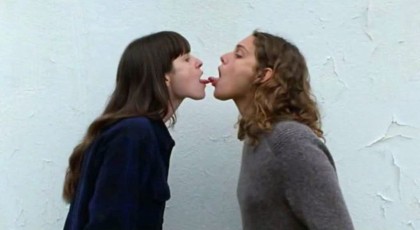 But strains are also showing in this symbiosis. Bella, who works in a local restaurant, has become quite sexually experienced, whereas Marina has never been interested in sex, or so she says. The film commences with an epic, increasingly funny girl-on-girl snog as Bella tries to teach Marina how to kiss, leading to several minutes of absurd tongue wrestling. Marina complains, “I’ve never had something wriggling in my mouth—it’s disgusting!” but still insists Bella “get on in there!” Bella recounts her dreams, which are filled with trees growing manifold varieties of penislike fruit. Marina later ponders her sexual identity, admitting to admiring aspects of the female form more, checking out other female bodies during a sojourn to the changing rooms of the local pool—she’d dream about tit trees—but not desiring them, and staring instead with glum curiosity at her form. She’s alarmed by the thought of a “piston” jackhammering away between her thighs, and in her conversations with her serenely unflappable, black-humoured father (Vangelis Mourikis), admits she has often liked to picture him naked but without a penis.