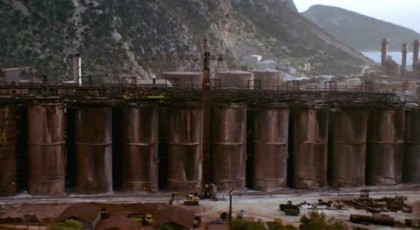 Things are changing for the trio who trio live in a bleak and lifeless seaside town built to house workers for a nearby mine and factory that burns and billows day and night with glowering import. Marina’s father was one of the architects of this glorified dormitory, but now detests it, describing it as a place where they seemed more interested in how it would look as ruins than as a place to actually live. It’s Greece, but you’d be hard-pressed to see anything Greek about this strange, denuded, depopulated locale. Marina and Bella’s relationship is turning distinctly icy, even as they still rely on each other to survive emotionally and imaginatively, as the disparity between their tastes in sex and life become more defined. The easy life father and daughter had becomes newly charged when Bella joins them and gives the father a massage.