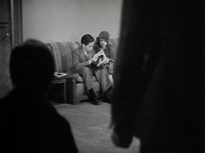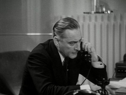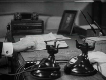 In one of his characteristic flourishes, Wyler teases the audience like another client waiting in line by keeping Simon out of sight; our lead-up to the “reveal” is Barrymore’s hands working the phones on his desk. When Barrymore finally appears, it seems designed to encourage applause, a frequent occurrence in the theatre when the big-name star makes his or her first entrance and a nod to the stage origins of the film. Over-the-shoulder shots with delayed reaction shots, a Wyler staple, also dot Counsellor at Law. The most effective one shows Harry standing, his fist clenched, when he hears Cora’s children disparage the working class. When we finally do see his beaten face wild with anger, Wyler switches to the children and moves slowly in on their frightened faces.
