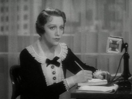 In the cartoon before the feature, the NFCS seemed to make a comment on the loss of yet another vintage theater. Scary Crows (1937) shows a flock of crows completely decimate a farmer’s field while his girlfriend laughs at him. This utterly unfunny Columbia Pictures cartoon lent a depressing air to the evening that was slow to dissipate. But dissipate it did under the blinding hyperactivity of Lee Tracy and the equally blinding blonde wig of his costar Ann Dvorak wrestling with an adaptation of the play Tinsel Girl by Maurine Watkins, the author of the play that formed the basis for the film Chicago (1927).
