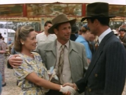 Skipping past World War II, the film takes us to 1946. Macauley is working for a traveling carnival as the resident boxer who takes on locals who hope to beat him and win a cash prize. He’s content enough with his carney family until he runs into a man he used to know in Eucla and is introduced to the man’s wife—Lily. Still in love with her, he disobeys orders to let his next local contender win the bout and takes all his hurt and anger out on the hapless bloke. That evening, he informs the carneys that he and Marge (Lorna Lesley), a young barker on the carnival midway, are getting married. The carnival owners warn him about making such a rash match, but he says that the only woman he wanted to marry is already married and reckons that he and Marge can make a go of it.