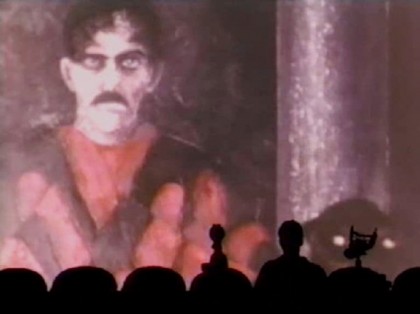 This sequence highlights both the dire lacks of Warren’s film, and the singular inspiration of the MST3K team, as the watching trio make up dialogue for the characters that is both very funny and yet makes much more hay out of the ludicrous situation unfolding on screen than the script ever did. The spectacle of the family trying to negotiate Torgo’s physical strangeness and incoherent mix of warning and greasy hospitality is newly inflected with surreal politeness (“You got family, Torgo?”) and sarcasm (“So what does the Master approve?”), which, ironically, combine to make the scene feel much more…well, realistic—suddenly the characters have depth and pathos, as well as even deeper strangeness. Torgo himself—described initially by Servo as “Tom Cruise is Dr. John!” like a pitch for some ridiculous, yet alarmingly possible, musical biopic—is frustrated with his master for hogging all the women who fall into their trap, and leers over Margaret when he gets her alone, a liberty she’s appalled by in spite of the fact he’s slightly more attractive than her husband. The family dog runs outside and is later found mauled to death, and then Debbie disappears, prompting a search that brings the family closer to the shrine where the priest and his wives sleep. Quite a lot of MST3K’s comic style was attuned to mocking lazy exposition and cheap directorial tricks, but “Manos” offers a challenge in that regard, considering that Warren seems barely aware of any directorial tricks. A rare instance is a clumsy flashcut between the sight of the Master and his previously glimpsed portrait back in the house: “Ooooooh I get it,” Servo murmurs sarcastically in response.