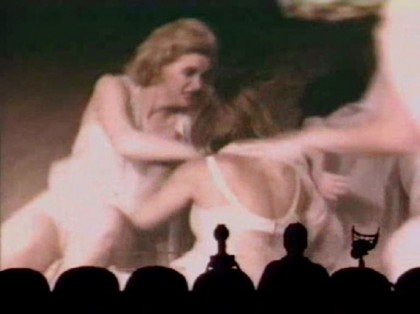 This image of an emptied shell is repeated again and again in Death of a Salesman, and is realized to its greatest effect—as only film can—in an overhead shot looking directly down into the Loman home. Schlöndorff surrounds this roofless, peeling dwelling with flats of the neighboring buildings. The image is very startling and emphasizes the vulnerability of this family. He contrasts it with memory scenes of the Lomans going off to watch Biff in the big game—trees, open fields, emphasizing youth and the wide-open possibilities that still exist for Willy and Biff. Schlöndorff sticks with a moody, staged production, with spotlights illuminating Ben and then fading when Willy returns to reality. Schlöndorff lets his camera go one time—when Willy is raving incoherently in a bathroom—spinning with Hoffman as he tumbles to the ground. He uses slow motion in a POV shot of Biff watching Rossetter twirl in her underwear and flop voluptuously on Willy’s bed, again suggesting an image in Biff’s mind rather than what probably happened. And, of course, he has the advantage of being able to shoot close-ups to capture the emotions that race through his actors’ eyes.
