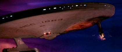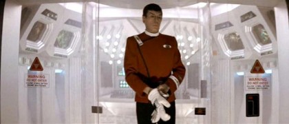 Meanwhile, the extraordinary potential of the Genesis Device seems to invoke all of the characters’ essential quandaries and capacities, promising both apocalyptic destruction and miraculous creation. Carol, to cheer up Kirk when he’s feeling depressed about the carnage that’s struck his ship and his son’s ferocious antipathy for what he stands for, ushers him along to take stock of a miracle: the grand cave within the Regular moon that she’s turned into a slice of Eden with the Genesis Device, her gift of maternal beneficence to all. Spock and McCoy, upon first learning of the Device’s existence, swing immediately into one of their classic ethical debates. Spock’s coolly measured curiosity striking sparks against McCoy’s fiery, knee-jerk humanism. McCoy mocks the Genesis Device by channelling advertising speak: “According to myth, God created the Earth in six days. Now watch out! Here comes Genesis! We’ll do it for you in six minutes!’ The thematic conflict of the human and the destructive is even acted out on the level of the canonical texts that preoccupy the characters—the shamanistic nihilism of Moby-Dick and the humanistic idealism and sacrifice that defines A Tale of Two Cities. Spock is, of course, the tragic hero, the Sidney Carton of The Wrath of Khan. His logical and unemotive persona, which McCoy always assumes to be inimical to humane concerns, proves, as Kirk croaks in delivering a eulogy for his dead friend, redolent of the most human soul. Spock, now actually the captain of the Enterprise, hands over command to Kirk without concern when crisis is nigh, reminding his reluctant friend that “You proceed from a false assumption—I have no ego to bruise,” and giving Kirk exactly what everyone knows he needs at the same time. Spock becomes the paragon of selfless action and finds his fulfilment of logic in the act of giving his life to save the Enterprise’s crew from certain destruction.