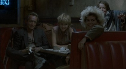 These wandering vampires, living out of cars and motels, feed off the easily missed in a vast nocturnal Midwest of scantly lit, depopulated streets, bleak motels, diners, honkytonks, and bus stops full of drifting flotsam. Carnivorous callousness contrasts ironically with the care that manifests between people, both in the human world and in their world. A ticket seller won’t help out an obviously ill young man, and Caleb’s assumed to be a junkie by a plainclothes cop (Troy Evans). And yet a security guard giving Caleb a few bucks to pay his fare, and Jesse and Diamondback, both resembling hippie wash-ups, adopt the social refuse they come across. Yet that pair also embodies something far more primal and dangerous. They reign over an amusingly sick facsimile of a nuclear family governed by their own perverse family values, wolfish in their darkness and lean hunger. Jesse himself is actually a Confederate veteran (“We lost!”), still embodying the bushwhacker creed. Bigelow plays games with the usual codes of that family structure, with the young boy the most grotesque of the lot and Caleb reduced to a mooching deadbeat getting his sustenance directly from Mae’s veins. The carefully cast Wright seems both delicate and doe-like in some scenes, and a strong, powerful antelope in others, relating to Caleb as if he is the damsel in distress—which he is initially.