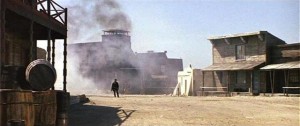 Eastwood’s properly terse performance, of course, made him the international film star he still is, and much of his appeal as presented here is as much about the quiet, sly good-humour he lets through Joe’s otherwise taciturn and unremitting exterior. He looks on the world much like a science experiment he’s running, sometimes a bit wryly disconcerted at how the experiment is proceeding, at least until it turns real, and then…you better run, boy. A Fistful of Dollars also sports the first of Leone’s immortally styled gun duels, defined by the rapid, rhythmic cutting between expectant faces, humour, and macho swagger slowly fading at the realisation that someone’s about to die, and then the concussive simplicity of the moment when the gunfire actually comes, with four or five men at a time dropping dead on the spot in a single, encompassing shot. Life is never more amazingly intense for Leone as in the few moments before it ends. l