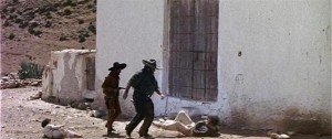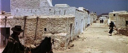 Joe, the first incarnation of the character dubbed “The Man with No Name” (that was essentially a United Artists marketing gimmick), is only guided by a moral compass based in personal empathy, and there’s not much of that. We don’t hold it against him he uses people he loathes to make some money: most of us do that. That he proves to be a proper good guy isn’t in question, but he is definitely one of those Leone protagonists who has “something to do with death”, who, even if they don’t realise it, in essence, bring apocalypse wherever they tread. Joe even poses as a knight-errant or a risen, vengeful angel. Still playing games of truth and illusion, letting off explosives so that he steps out of the smoke like a spook after, having survived torture and eluded the hunting Rojos, he recuperates and returns strapping wearing body armour culled from the iron of a boiler to fend off the rifle blasts he knows Ramón will loose at him. Joe finally confronts the Rojos when they turn their vicious attentions to Silvanito, and doesn’t leave the town until all his foes are decimated. The irony here is that Joe mythologises himself to scare his enemies into irrational decisions, just as Leone mythologises the proceedings with a self-conscious smoke-and-mirrors style.