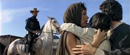The village sequence is close to the best thing Peckinpah ever did, a dream of frontier chivalry and communal festivity, the unifying desperation for a sense of purpose, colour, and nobility to life rather than petty oppression and everyday tyrannies. As such, it counterpoints the notorious ballets of blood in The Wild Bunch, eros to its thanatos, whilst also clearly providing the blueprint for the later film’s sadder, more elegiac village visit; the village could well be the same, taking the later criminal band as the ghosts of the good fellows under Dundee, the degraded end of the dream. The sequence also represents Peckinpah’s most overt nod to Ford, reproducing one of Ford’s favourite gags of the young tenderfoot skewered in the butt by an apache arrow and tended with necessary roughness, leading into a sprawl of behavioural delight, from Dundee and Tyreen both plotting how to seduce Teresa only to be foiled by rubber-limbed, half-shickered Graham cutting in for a dance, and Ryan and Linda swapping a look of knowing intensity before ducking out. Linda chasing after Ryan to give him his hat in the midst of the morning’s hangovers and pausing for a farewell kiss certainly represents Peckinpah’s most tender, sentimental interlude.