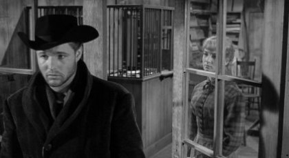 At that moment, Slade and his gang are robbing another bank. As is Slade’s custom, he kisses the first available woman. Dissatisfied with the dusty taste of the woman’s ruby red lips—forgetting that he kissed her through his mask—he sees the lovely Betsy Potter (Pamela Austin) glancing demurely in his direction. He lowers his mask, plants a good one on her, and drags a pen attached to a desk to her so she can write her address on a stolen $5 bill.