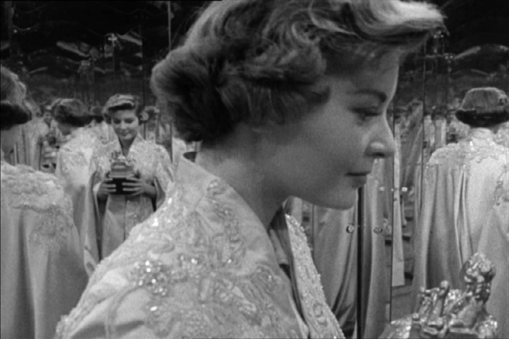 The third act has Eve exposed and baring her teeth as she moves aggressively to capture Bill, who rejects her, tries her luck with Hugh, and finally loses all of her early benefactors as they see her for the conniving careerist she is. In a heavy-handed ending, Eve, successful yet still unhappy, finds a young woman (Barbara Bates) in her suite. As Eve starts to use her as a gofer like Margo used Eve, we see the young woman don Eve’s elegant wrap, hold an award Eve just won, and bow before a three-way mirror, multiplying many times the image of the young hopeful set to exploit and displace the established star. This is a Hollywood image that gives just a little bit of dignity back to a theatre that, after Mankiewicz’s takedown, really needs it.