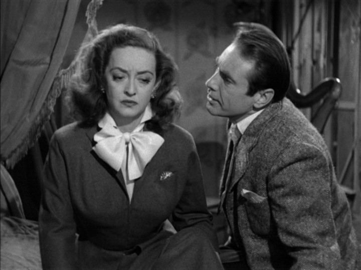 The conventional wisdom of the time gets an airing, too, as Margo’s only option at her age seems to be to get married while someone still wants her. Mankiewicz has her say to Karen after she and Bill have broken up, “That’s one career all females have in common, whether we like it or not, being a woman. Sooner or later we’ve all got to work at it, no matter what other careers we’ve had or wanted. And, in the last analysis, nothing is any good unless you can look up just before dinner or turn around in bed, and there he is. Without that, you’re not woman.” The feminist in me bridles at this scene every time, but a secondary theme of All About Eve, one that edges it toward women’s film territory, is the desire for love. Eve wants the love of the audience, Bill wants Margo to marry him, Karen wants to keep her loving friendship with Margo, Addison, yes even poor, closeted Addison, wants a companion and blackmails Eve into being that person. Margo’s philosophizing feels both true and another part she seems to be convincing herself she wants, fearing that the age difference between her and Bill will become a yawning chasm. I can hate the sentiment while acknowledging that there’s truth to it even today.