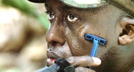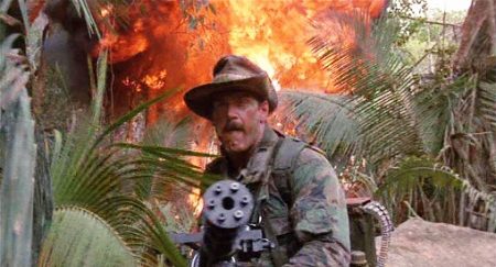The popular perception of the war is played out: firepower-packing Yanks arrive, clean up the regular fighters easily, but find themselves up against a foe that can hide and plays a game they’re crucially ill-equipped to deal with psychologically as well as in method. Blain carries a version of the Gatling gun, a weapon that carries historical associations dating back to the Civil War, and also connects again to ‘Nam where was mounted on a plane dubbed Puff the Magic Dragon, used to devastating effect. And yet, like Hopper’s crew before them, who stand in for the lost patrols of ‘Nam, Dutch’s team finish wasting vast amounts of ammunition and muzzle velocity firing blind into the trees, hoping to hit something, fighting their own magic dragon. The team make an increasingly desperate trek to try and reach safe ground where Phillips’ helicopters can extract them, an extraction that has to wait because of the potential political furore that would explode if any US choppers were downed on the wrong side of the border. Hawkins’ death is followed quickly by Blain’s, felled by even bigger firepower, sparking the maddened wastage of ammo from his fellows. Trying to secure a position for the night, the team set traps that are deliberately triggered by the Predator with the ruse of driving a colossal wild pig through them, a beast Mac slays in the dark believing it’s his mortal foe, whilst the alien snatches away Blain’s body to use in its trophy-making habits.