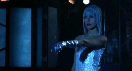 “Duelle” is an invented word, a feminised version of “duel,” and it’s with good reason the film has such a title: the story is strung along by a series of intimate pas de deux between competing characters who exhibit and swap places of command and submission, desire and pathos. Every sequence up until the very central one is dominated by interactions of only two characters; in that centrepiece, a crucial sequence in both the literal (as the 15th of the film’s 30 individual scenes) and narrative sense, as the core characters encounter each other in the Rumba and William Lubtchansky’s gliding camera absorbs them as they chase, challenge, flirt and dance with each other. It’s here the story finally becomes less opaque, whilst, ironically, the cinematic technique becomes more overtly surreal; The Fairy Godmother works an influence on Pierrot, who approaches a mirror, raises his hand—as Elsa recalled Max once doing—and cracks the glass with magical force. This gesture reveals to him the two demi-goddesses, Leni and Viva, in their true forms, approaching each other in ritualistic style and pledging to continue their metaphysical contest for the jewel, holding their hands up like Pierrot’s gesture. This, it seems, indicates the mirror-image, dualistic bind of the two supernatural forces (even if, in their disco-glam outfits, they look like they’re about to start singing “Dancing Queen”).