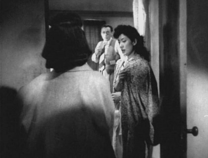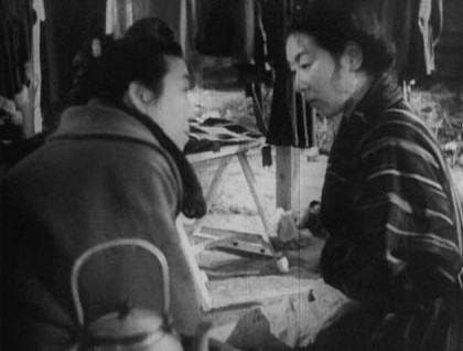 An irony of Mizoguchi’s life was that he was a rootless man who often took refuge amongst geishas, throwing into fascinating relief his constant refrain of worrying about the lot of women who took that line of work, or the less privileged one of prostitution nominally beneath it, because he was implicit in the power disparity he portrayed with such acid intensity. But he had also been deeply affected by he fact that his own sister had been sold as a geisha when he was a boy. The world of Women of the Night, an adaptation of a novel by Eijirô Hisaita, has lost the shape it had in pre-war works like Naniwa Elegy and Sisters of the Gion (both 1936). Everyone’s fair game now in a world in which vital loved ones have vanished, some to return, some forever. Fusako Owada (Kinuyo Tanaka) deals with both, having waited years to learn of her husband’s fate, living in the slums and resisting the suggestions of the woman who buys and sells clothing that she take up prostitution to provide for her consumptive baby son. She learns of her husband’s death from Kuriyama (Mitsuo Nagata), the owner of the trading firm he used to work for. Some months later, she encounters her sister Natsuko (Sanae Takasugi), who had gone to live in Korea as a colonist, where she was raped during the evacuation, and now works as a taxi dancer at a nightclub. Natsuko moves in with Fusako, who’s since landed a secretarial job at Kuriyama’s company, but whose son has died.