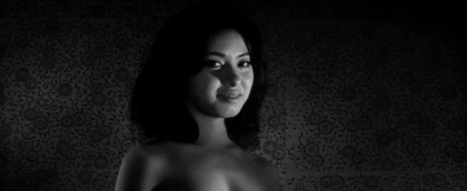 The declaration of Harumi’s status and profession immediately indicts her not as a meek or pathetic victim but as someone who will embrace with increasing volatility her role as a transgressor, a kind of guerrilla warrior against the entrapping paradigms of male dominance and military hierarchy. Her aggression is precisely envisioned in the very next shot: a knife hacks into frame, bright against the surrounding darkness. Harumi is wielding this weapon. The third shot is split, one side presenting a stylised tavern, represented as a table and chairs surrounded by epic darkness, and Harumi, wielding the knife, threatens her lover’s bride, telling her to go back to Japan, whilst the other side of the frame contains the wedding photo for the couple, emblem of the formal ties and powers that now weigh against Harumi. Suzuki cuts to a fourth shot, an inversion of the last in that now he offers an all-white room as the space in which Tomoda apologises to Harumi and explains that nothing need change between them. Harumi continues to insist he get rid of his wife, but then kisses him with voracity and bites his lip almost clean off, as visceral a depiction of erotic intimacy segueing into physical horror as any in cinema.