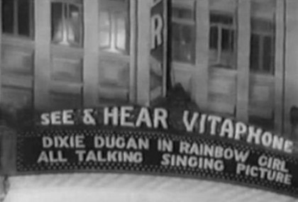 Where this film is of particular interest to those with an interest in film history is in its depiction of the mechanics of filmmaking at the dawn of sound. A Show Girl in Hollywood was made using a Western Electric imbedded sound track, but it depicts the making of a film using the Vitaphone record-synching system (see the conducted by the Northwest Chicago Film Society, which arranged the screening of A Show Girl in Hollywood I attended), and since Vitaphone was a coproducer of this film, their product is advertised prominently. In one scene, Dixie stands in front of an early soundstage door that warns people not to go in when the red lights are on because they indicate that “Vitaphoning” is taking place. The Vitaphone process is further advertised on the theatre marquee at the premiere of Rainbow Girl with a shortened version of the famous “All Talking! All Singing! All Dancing!” line that heralded MGM’s 1929 talkie The Broadway Melody to the world, and it is mentioned by the radio announcer interviewing the stars making their way into the theatre. (Fun cameos of Loretta Young, Al Jolson, Ruby Keeler, and Noah Beery Sr. and Jr. walking the red carpet are a bonus feature; also marvel at the sight of a very young Walter Pidgeon introducing Dixie for a curtain speech after the film.)