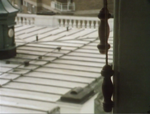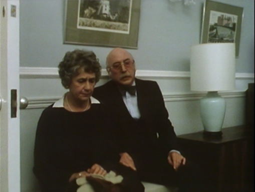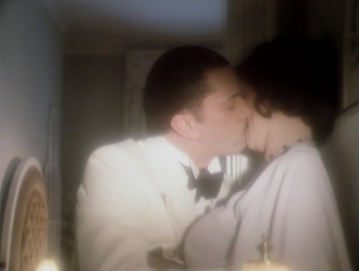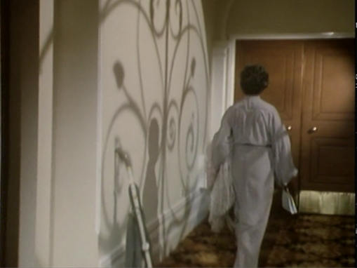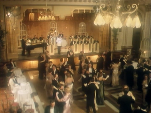 The production design and cinematography are particularly noteworthy for a television play. A gauzy glow inflects the flashbacks, but the present isn’t completely present. A warm sepia envelopes the modern hotel environs. Bernard complains about the old people in the sparsely populated tea room, seemingly unaware that he’s pushing 70 himself. Later, Bernard finds himself thrown back in time, hallucinating that the young people at the hotel for a dinner/dance of the type that was a nightly occurrence in his day are actually people from the ’30s. Some interesting camera angles frame Bernard and Jean as relics of the past; for example, in one scene, when Jean is returning to her room, a shadow of the Victorian ironwork in the hallway mixes with her shadow, as though she were a piece with it, as well as a prisoner of a bad choice made long ago.