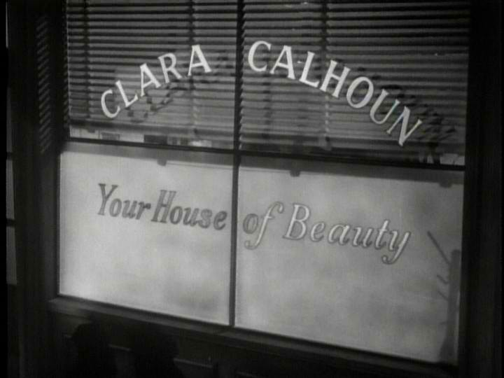 We start in noir country—a nightscape of a city street lined with bright theatre marquees. The camera moves down the street and swoops down to a close-up of a shop window advertising “Clara Calhoun: Your House of Beauty.” The door opens to Clara herself (Jane Randolph) ushering a happy patron with a new coif out with hopes that she gets home safely. The remark was meant to flatter the patron, but it has portends of a tragedy soon to befall the shop.