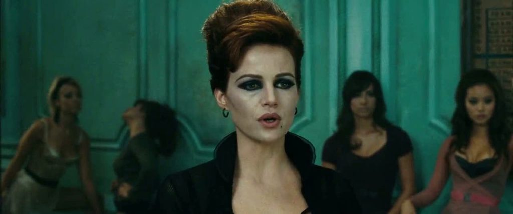 Soon after, the narrative seems to move into another reality, one that still follows the basic parameters—rather than a nominal flunky Blue is the impresario-pimp in a nightclub-brothel where he and his thugs keep the dancers as prisoners and concubines, and the asylum’s chief psychiatrist, Dr. Vera Gorski (Carla Gugino, wielding an amusingly cheesy Slavic accent), is the club’s choreographer. They stage garishly spectacular, erotic gyrations for the rich men who frequent the club. Snyder follows with a montage that cuts between Blue and Vera singing Roxy Music’s “Love is the Drug,” scenes from the other performances by the dancers, and vignettes depicting a tough guy entering the club, leaping in ecstasy in watching the performances, buying a roll with one of the girls, and then getting himself beaten up and hurled out after losing his cool in a poker match. The editing and camerawork in this sequence is worthy of Scorsese in one of the most electric bits of moviemaking I’ve seen in several years, a delirious sprawl of flying dollar bills, glasses being filled, huge make-up-plastered lips and eyes, and flashes of absurd dance routines in which Indian princesses, naughty nurses, and crucified angels excite the clientele.