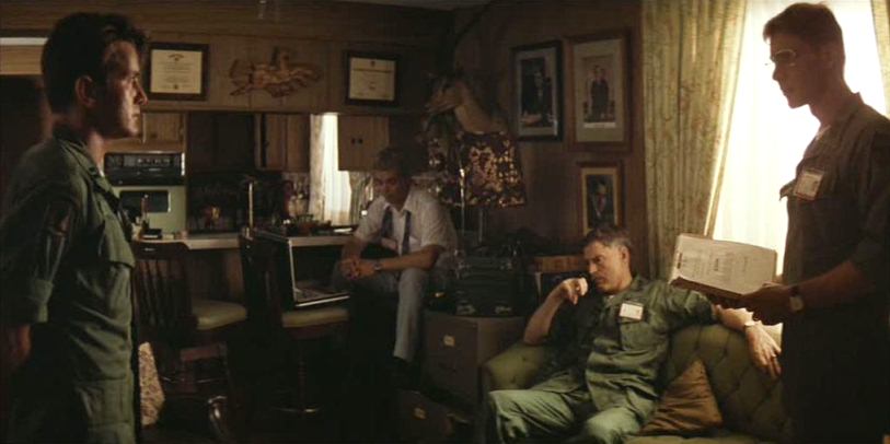 Willard’s call to action comes from contemplative General Corman (G. D. Spradlin) and his doughy, unctuous underlings, men who seem to embody the cool distance between object and enterprise in the war, playing tapes of Kurtz’s eerie, disembodied, shamanistic speeches broadcast from the edge of nothingness, passing around shrimp that sits dead on the plate like alien harbingers (“…You’ll never have to prove your courage in any other way.”) whilst the coded statements and charged looks of the men communicate the profound and forbidden necessity of the mission. The General’s musings on the battle that Kurtz has lost are at once facetious and genuinely prognosticative, as if suggesting that the truth is not hard to find, but experiencing it is an entirely different animal.