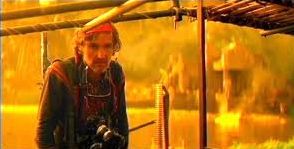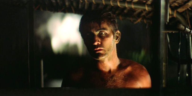The boat’s journey maps the nature of the conflict like stations of the cross. The surreal USO show sees Playboy playmates gyrating to please the young and desperately horny soldiers whilst dressed up in a mockery of America’s historical wars—cavalry, cowboys, and Indians transformed into erotic tease—whilst the young men are worked up to a pitch of excitement so great some finish up dangling from the helicopter trying to snatch the lovelies away again. This moment evokes the inevitable conclusion of the war in images of helicopters ferrying out refugees from the fall of Saigon, played out here in anticipation as tragicomic burlesque show. The violently surreal disparity between this situation and the other world, the “real” world of home, is hinted again, whilst exploitation of young men and young women is presented in a double bind. Willard’s lesson gleaned about the nature of the war, the realisation that the enemy has no such illusions, no other home, no other reality (“His idea of great R’n’R was some cold rice and a little rat meat.”) is one that echoes through to Kurtz’s prescriptions for a war that should be fought purely by dedicated, amoral creatures facing such a determined enemy with so little to lose. Later, when the crew of the boat re-encounter the playmates, Willard is able to swap petrol for sex, an act of veritable prostitution that turns nonetheless into an islet of clumsy, but eager carnality and quicksilver emotions. The gorgeous young women and their soldier-johns at first graze off each other rather than meet. Chef tries to mould Miss May (Colleen Camp) into the simulacrum of her poster whilst she reminisces about her days as a birdkeeper in a zoo. The Playmate of the Year (Cynthia Wood) rambles anxiously about her exploitation whilst the increasingly spacey Lance paints her into an otherworldly idol.