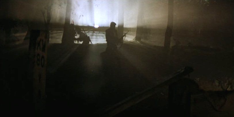 Some of Coppola’s touches of pathos, like the tape recording of Clean’s mother reading a wooden birthday message whilst his crewmates are confronted with his body, are a little heavy-handed, and can be criticised for perpetuating a certain American egotism in the face of the war’s suffering. Still, the film hardly skimps on visions of the war as a grotesque infliction, particularly early on as civilians are evacuated in landing craft that close up like monsters and the land is pillaged. Part of the thesis here is that the reasons the opposing sides fought were completely different, and moreover that war in the world is merely an extension of war within the self. The essential Sisyphean nature of the struggle is clearly invoked by the symbol of a bridge that is constructed each night and smashed each day, glimpsed through the LSD-hued viewpoint of Lance as he and Willard stalk the battle zone where terrified, hollow-eyed mostly black GIs like the Chief and Clean suffer an injustice within an injustice. Ghostly armies lurk throughout Apocalypse Now, including Kurtz’s eerie band of white-painted guerrillas and the force defending De Marais’ remote plantation seeming to resolve out of the fog like a spectral band guarding the memory of the dead of Dien Bien Phu. It is these anachronistic warriors to whom Phillips entrusts Clean’s body as icon of the war’s dead, and they enact the proper funeral service with backwoods rigour.
