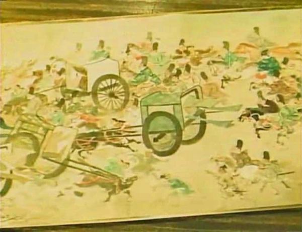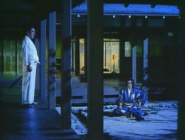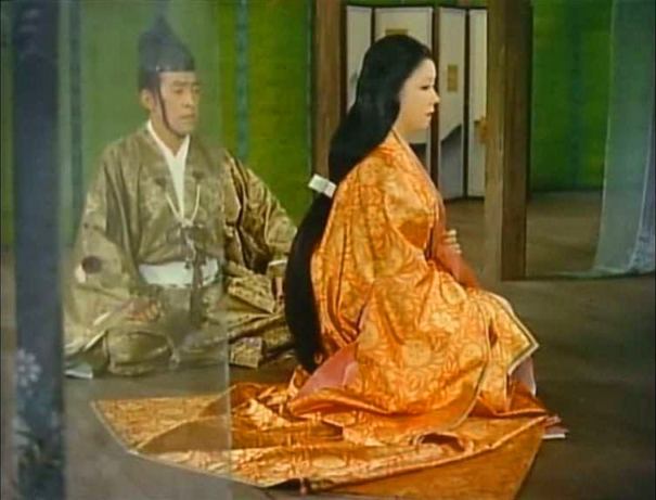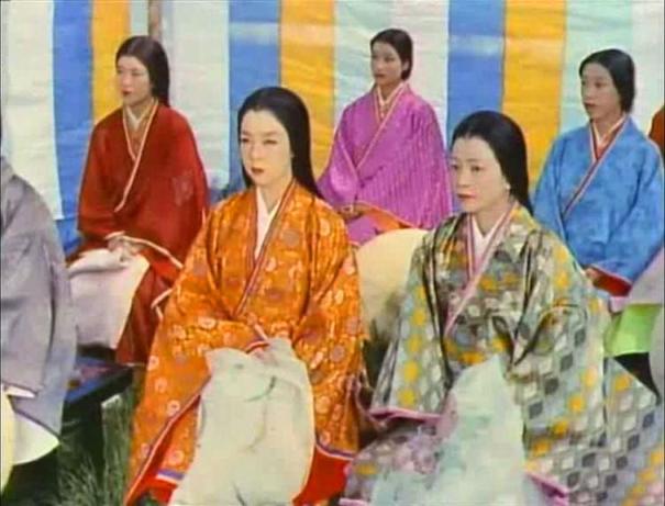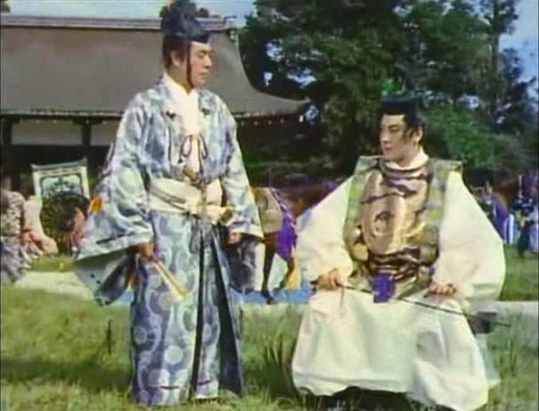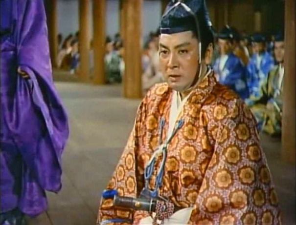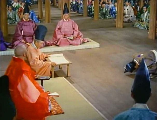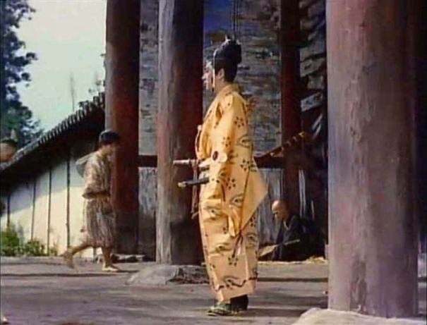 Moritoh visits a shrine for the dead set up just next to the Sanjo palace’s jigokumon, or, literally, hell gate. Moritoh encounters Kesa and her aunt Sawa (Kikue Môri) there, also intending to pray for the fallen, and Moritoh’s interest in the comely courtier hardens into ardour. When the time comes for the emperor to reward his followers for their aid, Moritoh asks to be given Kesa’s hand in marriage, and only then learns that Kesa is married to one of Kiyamori’s ministers, Wataru Watanabe (Isao Yamagata). Moritoh refuses to retract his request, asking the emperor to annul the marriage and thus entering into a public and conscious rivalry with Wataru.