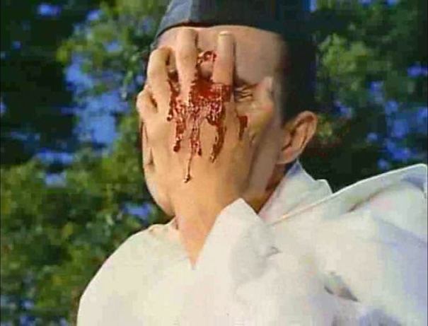 The rush of action in the first 10 minutes is worthy of Eisenstein or Michael Curtiz in its precise design and flow. Kinugasa’s camera is either at eye level or dizzyingly high above the action, in shots filled with actors and extras arranged in streams of colour, the panicking populace and chasing armies churning like multicoloured flotsam under boughs of hallucinogenic green leaves, more like an explosion in an orchard than a battle. This leads to the hard, vigorous edits of the decoy carriage and its guards fleeing, Kesa within the carriage fainting from the heat and bustling motion as the pursuers catch up with the retinue, who turn to engage in a few seconds worth of brutal combat. Moritoh cuts his way through a swathe of enemies with devastating panache, and repeatedly demonstrates his utter loyalty to his chosen master, even going so far as to riposte to his brother’s entreaties of pragmatism with the assertion that once a man’s given his loyalty, that’s the end of the matter. Moritoh’s race to reach the emperor’s friends at an island temple is another dazzling little sequence, as he chases a team of enemy assassins, shooting arrows at their backs, one plunging from his mount and lolling on the beach dying, his furled fingers leaking sand in symbolic place of his blood and life; but a few minutes later, Kinugasa offers a jarring moment of gore as in Moritou’s duel with the traitor, he lands a katana blow to the enemy’s face, bright gleaming blood seeping between his fingers before Moritou lands the coup de grace.