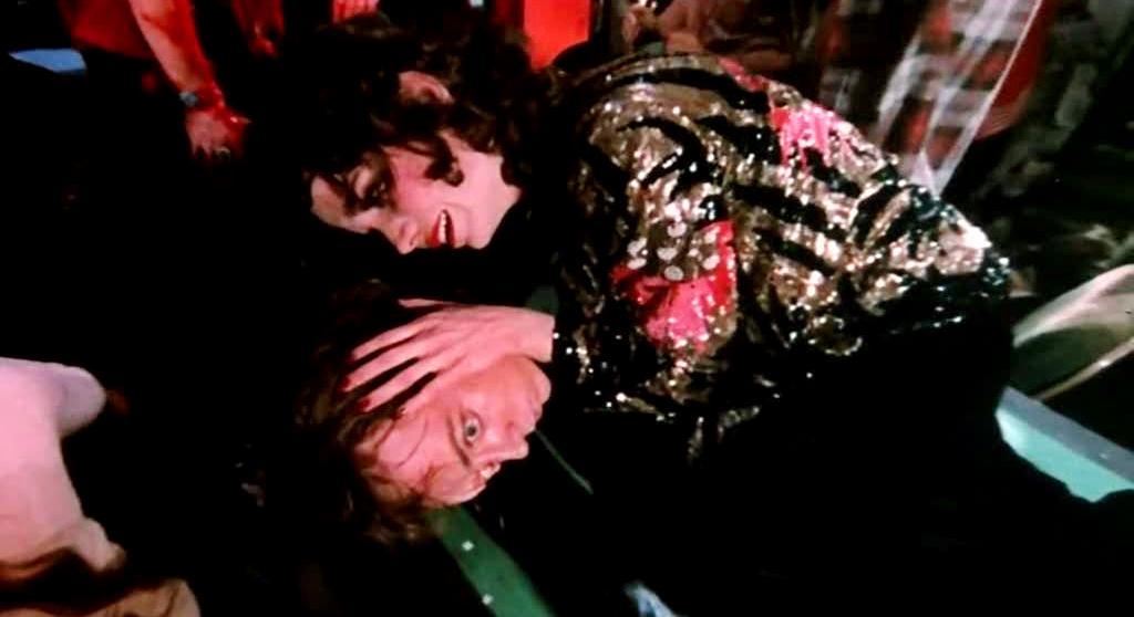 The film’s impresario supervillain Swan (Paul Williams) is depicted as the force behind all of the movements in recent music, a man who sold his soul to the devil for eternal youth and therefore always has his pulse on the current youth spirit. Phantom kicks off with an expository voiceover by Twilight Zone scribe Rod Serling positioned somewhere between rock-doc awe and sinister prelude, before the opening credits unfurl over a performance by Swan’s current hit band The Juicy Fruits, a satire on the nostalgic shtick of Sha-Na-Na, Grease, The Rocky Horror Show, and other self-consciously retro theatre pieces and acts of the early ’70s. This opening is more gruesome than any of the physical violence that follows, as sleazy mock-greasers fondle each other and audience members, and nearly break into fights, whilst singing an absurd song about a heroic musical artist who killed himself get a hit record and save his sister’s life with the profits. The jokey image of the mock self-annihilation by stabbing repeats later in the film in a “real,” yet also even more flagrantly artificial, context.