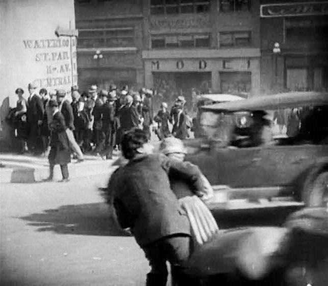 Glazed in Murnau’s nocturne eroticism, the first third of Sunrise suggests the distant prototype of all film noir, with a dash of Theodore Dreiser’s An American Tragedy. If the Wife is femininity rendered stale and mute, so, too, the Man’s masculinity is contorted and volatile. When the Man returns to his home, carrying the guilty bundle of bulrushes, the Wife pulls a blanket over his sleeping form with a care that’s sublime, and when he seems the next day to reach out to her, she’s all too willing to believe he’s coming back to her. The build-up to the Man’s aborted attempt to kill his wife is prolonged when the family dog senses evil in the air and jumps aboard their rowboat, forcing the Man to turn back and take the dog inside. The Wife’s buoyant mood sinks in sensing, but not quite realising, her husband’s nihilistic mood, a mood that finally shows itself when he rises to do the deed, stiff and hunched, arms straight at his sides, like Orlock in Nosferatu But his wife’s terror brings the man back to his senses. He chases after her when, after they reach the shore, she flees onto a trolley, and the two journey into the city barely aware of anything except their own mutual horror and shame.