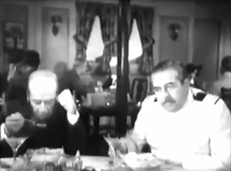 We are introduced immediately to the godhead of the story, Captain Helquist (Walter Connolly), who talks with two reporters about why he hates his job. He can’t stand being in charge of a cruise ship filled with the hoi polloi carrying on their sordid, uninteresting affairs. When asked why he went to sea to begin with, he tells a story of his long-bearded father who used to slurp his soup while resting his head on his bent arm; one day, the temptation to knock his father’s arm out from under him proved too great, and as soon as the old man had picked his beard out of his meal, he flung his son out to make his fortune. Naturally, this wonderful tale with echoes to Synge’s Playboy of the Western World must be played out for us—a passenger (Donald Meek) with a similarly long beard and identical table habits is seated on his right at the captain’s table by Helquist’s buffoonish first mate Layton (Leon Errol). The film is loaded with character actors who are adept at playing small parts indelibly, and this triumvirate of great character actors provides a great number of comic bits that liven the proceedings.